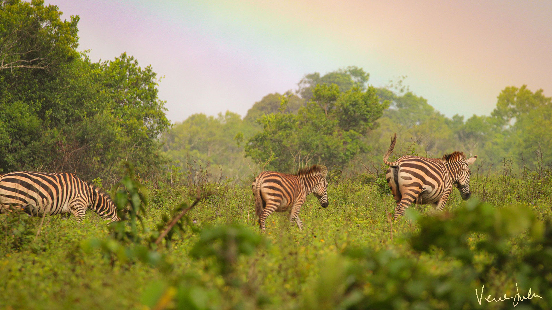 Sept. 2025: Baby Zebra with Family behind Rainbow, Kenya